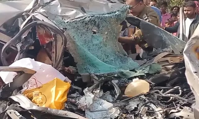 இந்த நிலையில் நேற்று அதிகாலை பகாரியா ஜூலன் கிராமத்துக்கு அருகே கார் சென்று கொண்டிருந்தபோது திடீரென டிரைவரின் கட்டுப்பாட்டை இழந்தது. அதனை தொடர்ந்து எதிர்திசையில் வந்து கொண்டிருந்த லாரியின் மீது கார் நேருக்கு நேர் மோதி விபத்துக்குள்ளானது.