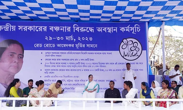 மேற்குவங்காளம் மீது மத்திய அரசு பாரபட்சமாக நடந்துகொள்வதாக கூறி மம்தா பானர்ஜி தர்ணா போராட்டத்தில் குதித்துள்ளார். தேசிய ஊரக வேலைவாய்ப்பு உறுதி திட்டம், சாலை மற்றும் வீட்டுவசதித்துறைகளுக்கு மத்திய அரசு நிதி வழங்கவில்லை என்று குற்றஞ்சாட்டி மம்தா பானர்ஜி தர்ணா போராட்டத்தில் குதித்துள்ளார்.