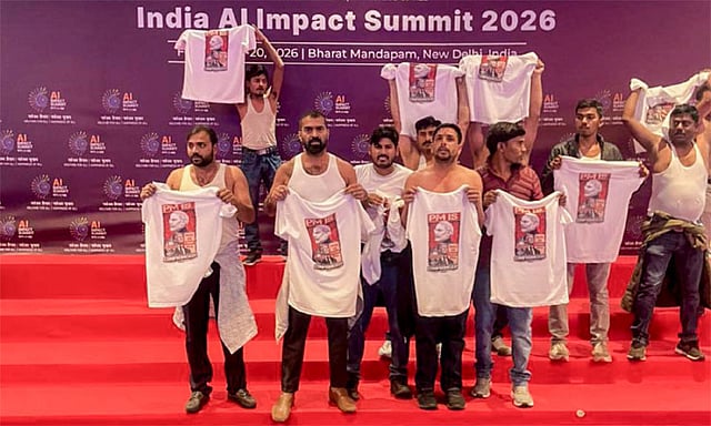 இந்த நிலையில், இன்று காங்கிரஸ் கட்சியின் இளைஞர் அமைப்பினர் சிலர் ஏ.ஐ. உச்சி மாநாட்டின் கண்காட்சி அரங்கத்திற்குள் புகுந்து போராட்டத்தில் ஈடுபட்டனர். அவர்கள் அணிந்திருந்த டி-சர்ட்டுகளில் பிரதமர் மோடி, அமெரிக்க அதிபர் டிரம்ப் ஆகியோரின் புகைப்படங்கள் அச்சிடப்பட்டிருந்தன.