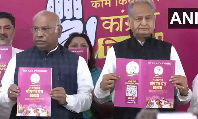 காங்கிரஸ் கட்சியின் தலைவர் மல்லிகார்ஜுன கார்கே, ராஜஸ்தான் முதல்-மந்திரி அசோக் கெலாட் இணைந்து இன்று தேர்தல் அறிக்கையை வெளியிட்டுள்ளனர்.