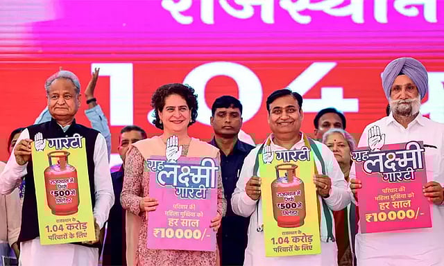 ராஜஸ்தான் தேர்தலில் காங்கிரஸ் கட்சி மீண்டும் வெற்றி பெற்றால் கியாஸ் சிலிண்டர் 500 ரூபாய்க்கு வழங்கப்படும் எனவும், குடும்ப தலைவிகளுக்கு ஆண்டுக்கு ரூ.10 ஆயிரம் வழங்கப்படும் என்றும் முதல்-மந்திரி அசோக் கெலாட் உறுதியளித்தார்.