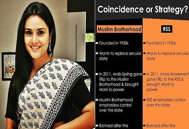 ரம்யா வெளியிட்டுள்ள புகைப்படத்தில் இரு இயக்கங்கள் இடையிலான ஒற்றுமையை பட்டியலிட்டுள்ளார். இரு இயக்கங்களும் தொடங்கப்பட்ட ஆண்டு, அவர்களுடைய நோக்கம், பிராந்தியத்தில் அவர்களுடைய செயல்பாடு ஆகியவற்றில் இருக்கும் ஒற்றுமை என பட்டியலிட்டுள்ளார். தேசியத் தலைவர்களின் படுகொலைகளில் தொடர்பு காரணமாக இரு அமைப்புகளும் சட்ட விரோதமாக செயல்பட்டதாக தடை செய்யப்பட்டது எனவும் கிராஃபிக் கூறுகிறது. அரபு எழுச்சியின் காரணமாகதான் 2011-ல் முன்னாள் அதிபர் முகமது முசோரி ஆட்சிக்கு வந்தார். ஊழலுக்கு எதிராக அன்னா ஹசாரே போராட்டம் நடத்தியதால்தான் மோடியும் பிரதமர் ஆக முடிந்தது எனவும் குறிப்பிட்டுள்ளார்.