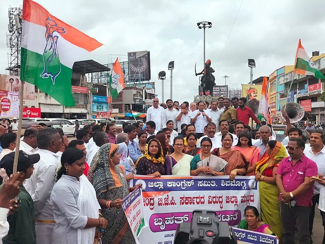 அதன்படி சிவமொக்காவில் நேற்று காங்கிரஸ் கட்சியினர் போராட்டத்தில் ஈடுபட்டனர். அப்போது பி.எச்.சாலையில் உள்ள சிவப்பா நாயக் சர்க்கிளில் கூடிய காங்கிரஸ் கட்சியினர் போராட்டத்தில் ஈடுபட்டனர். இந்த போராட்டத்தில் முன்னாள் மந்திரி கிம்மனே ரத்னாகர், முன்னாள் எம்.எல்.சி. பிரசன்ன குமார், மாவட்டகாங்கிரஸ் தலைவர் உள்பட பலர் கலந்து கொண்டனர்.