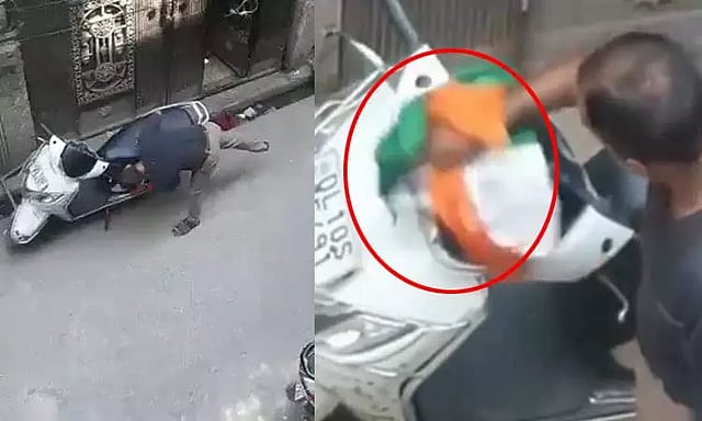 இரு சக்கர வாகனத்தை தேசியக்கொடியால் சுத்தம் செய்ததை அப்பகுதியில் உள்ள ஒருவர் மாடியில் இருந்து வீடியோ எடுத்து சமூகவலைதளங்களில் பதிவேற்றியுள்ளார். அந்த விடியோ தற்போது வைரலாகி வருகிறது.