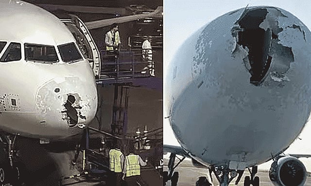 இதில், விமானத்தின் முகப்பு பகுதியில் பெரும் சேதம் ஏற்பட்டது. அதிர்ஷ்டவசமாக 227 பயணிகள் உயிர்தப்பினர். மோசமான வானிலை காரணமாக, ஆபத்தில் சிக்கிய இண்டிகோ விமானம் பாகிஸ்தானின் வான்பரப்பை பயன்படுத்த அனுமதி கேட்கப்பட்ட நிலையில், அது நிராகரிக்கப்பட்டுள்ளது. அதன்பிறகு, வழக்கமான பாதையிலேயே, மோசமான வானிலையை எதிர்கொண்டு, விமானம் பத்திரமாக தரையிறங்கியது.