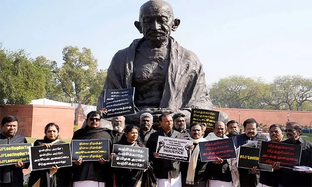 இந்நிலையில், மத்திய அரசின் இடைக்கால பட்ஜெட்டில் தமிழ்நாட்டுக்கு போதிய நிதி ஒதுக்காததை கண்டித்தும், வெள்ள நிவாரணம் வழங்காததை கண்டித்தும் நாடாளுமன்ற வளாகத்தில் உள்ள காந்தி சிலை முன்பு தி.மு.க. எம்.பி.க்கள் மற்றும் கூட்டணிக் கட்சி எம்.பி.க்கள் கருப்பு நிற உடை அணிந்து ஆர்ப்பாட்டத்தில் ஈடுபட்டுள்ளனர்.