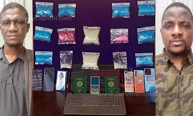 அவர்கள் கொடுத்த தகவலின்பேரில் ரூ.2 கோடி மதிப்பிலான எம்.டி.எம்.ஏ. உள்பட பல்வேறு போதைப்பொருட்கள் பறிமுதல் செய்யப்பட்டது. மேலும் அவர்களது பாஸ்போர்ட்டு, செல்போன்களையும் போலீசார் பறிமுதல் செய்தனர். அவர்கள் விற்பனை செய்யும் போதைப்பொருட்களுக்கு ஆன்லைன் வழிகளில் பணம் வசூலித்துள்ளனர். அவர்கள் 2 பேரையும் போலீசார் கைது செய்தனர். மேலும் அவர்கள் மீது வழக்குப்பதிவு செய்து விசாரணை நடத்தி வருகின்றனர்.