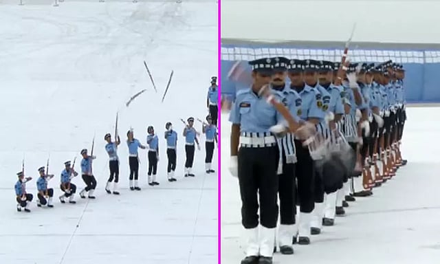 இந்திய விமான படை தினத்தில் வீரர்கள் செய்த சாகச பயிற்சி காட்சிகள் கண்ணை கவரும் வகையில் அமைந்துள்ளன. வீரர்கள் கைகளில் துப்பாக்கிகளை ஏந்தியபடி அணிவகுப்பு நடத்தியபடி, பல்வேறு சாகச காட்சிகளையும் செய்து காண்பித்தனர். இதனை பார்வையாளர்கள் வரிசையில் அமர்ந்தபடி, இந்திய விமான படை தலைமை தளபதி வி.ஆர். சவுத்ரி தனது குடும்பத்தினருடன் பார்வையிட்டார்.