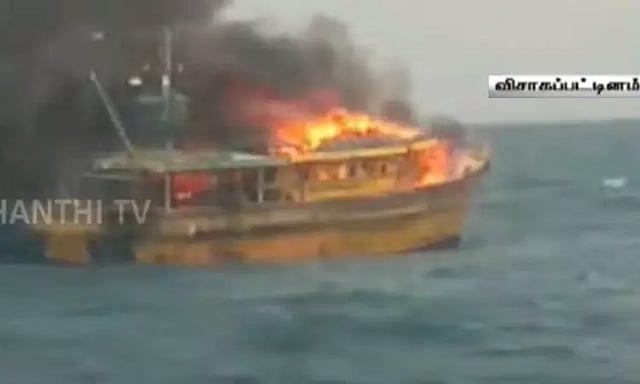 ஆந்திர மாநிலம் விசாகப்பட்டினம் மீன்பிடி துறைமுகத்தில் இருந்து இன்று அதிகாலை ஒரு படகில் 5 மீனவர்கள் மீன்பிடிப்பதற்காக கடலுக்குச் சென்றனர். இந்நிலையில், நடுக்கடலில் இன்று மதியம் அவர்கள் மீன்பிடித்துக் கொண்டிருந்தபோது, படகில் இருந்த மோட்டார் திடீரென தீப்பிடித்து எரிய தொடங்கியது.