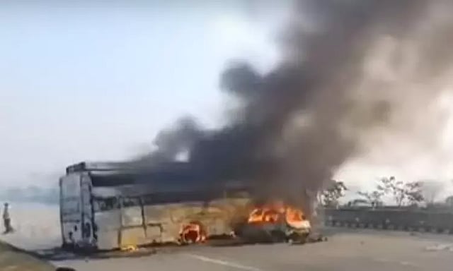 ஆக்ராவில் இருந்து நொய்டாவிற்கு பயணிகளை ஏற்றி சென்று கொண்டிருந்த ஆம்னி பஸ் உத்தரப்பிரதேச மாநிலம் மதுராவில் உள்ள மகாவன் காவல் நிலைய எல்லைக்குட்பட்ட யமுனா எக்ஸ்பிரஸ் சாலையில் வந்து கொண்டிருந்தது. அப்போது ஆம்னி பஸ்சின் டயர் வெடித்து கட்டுப்பாட்டை இழந்தது. இதனால் பின்னால் வந்த கார் பஸ் மீது மோதியது. இந்த விபத்தில் பஸ் மற்றும் கார் தீப்பிடித்து எரிய தொடங்கின.