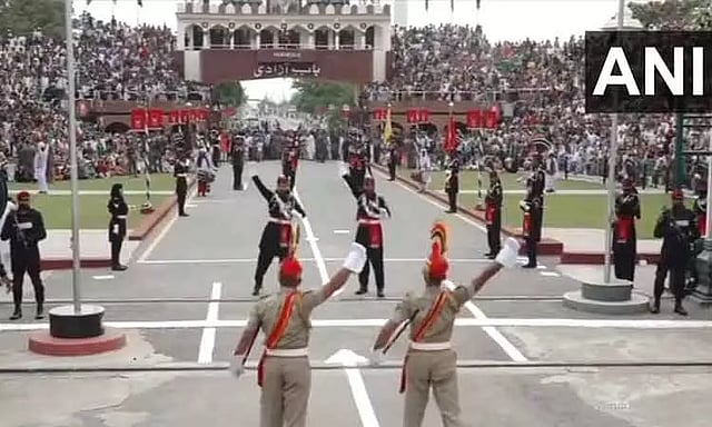 இந்நிலையில், இந்தியாவின் 77வது சுதந்திர தின விழா இன்று நாடு முழுவதும் கோலாகலமாக கொண்டாடப்பட்டு வரும் நிலையில் இந்தியா -பாகிஸ்தான் வாகா எல்லையில் தேசியக்கொடி இறக்குதல் நிகழ்ச்சி விமரிசையாக நடைபெற்றது. எல்லை பாதுகாப்பு படை வீரர்களின் மிடுக்கான அணிவகுப்புடன் தேசிய கொடியை இறக்கும் நிகழ்ச்சி கோலகலமாக நடைபெற்றது. வாகா எல்லையில் ஆயிரக்கணக்கான மக்கள் குவிந்து தேசியக்கொடி இறக்கும் நிகழ்ச்சியை கண்டுகழித்தனர்.ஜெய்ஹிந்த என்ற முழக்கம் விண்ணை முட்டும் அளவுக்கு மக்கள் உற்சாக குரல் எழுப்பினர்.