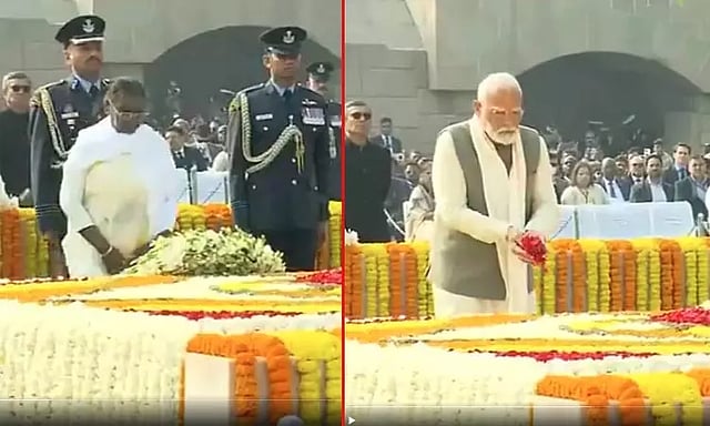 இந்த நிலையில், காந்தியின் நினைவு தினத்தையொட்டி, டெல்லி ராஜ்காட்டில் உள்ள மகாத்மா காந்தியின் நினைவிடத்தில் பிரதமர் மோடி மற்றும் ஜனாதிபதி திரவுபதி முர்மு மலர் வளையம் வைத்து அஞ்சலி செலுத்தினர். மேலும், துணை ஜனாதிபதி ஜகதீப் தன்கர், மத்திய மந்திரிகள் ராஜ்நாத் சிங், மனோகர் லால் கட்டார் உள்ளிட்டோரும் மலர் வளையம் வைத்து அஞ்சலி செலுத்தினர்.