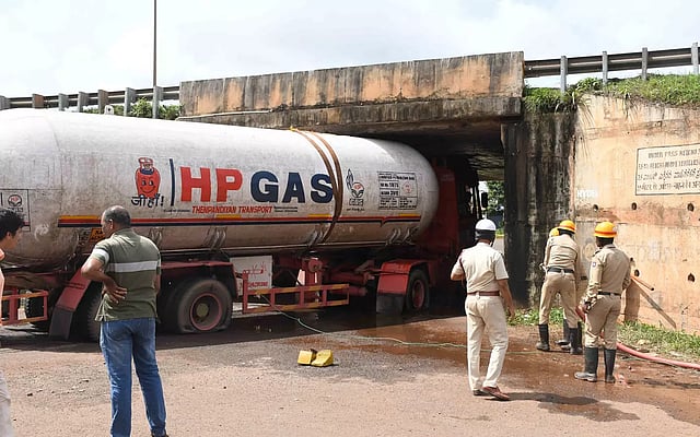 தார்வா அருகே பேளூர் பகுதியில் புனே-பெங்களூரு தேசிய நெடுஞ்சாலையில் எச்.பி. நிறுவனத்துக்கு சொந்தமான கியாஸ் டேங்கர் லாரி ஒன்று சென்று கெண்டிருந்தது. அந்த டேங்கர் லாரி நேற்று முன்தினம் மாலை 6.20 மணி அளவில் பேளூர் அருகே தார்வார் ஐகோர்ட்டு கிளை பகுதியில் சர்வீஸ் சாலைக்கு சென்று சுரங்கப்பாதை வழியாக பாலத்தின் அந்த பகுதிக்கு செல்ல முயன்றது. அப்போது திடீரென்று அதன் மேல் பகுதி பாலத்தில் உரசியப்படி சிக்கி கொண்டது. மேலும் டேங்கரின் மூடியும் சேதம் அடைந்ததாக தெரிகிறது.