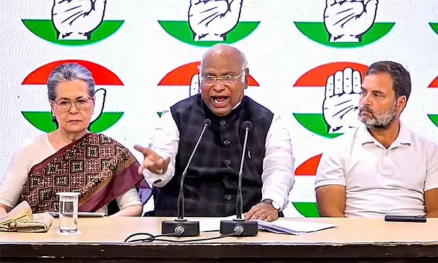 இந்தநிலையில், டெல்லியில் காங்கிரஸ் கட்சி தலைவர் மல்லிகார்ஜுன கார்கே, சோனியாகாந்தி, ராகுல்காந்தி ஆகியோர் கூட்டாக செய்தியாளர்களை சந்தித்தனர்.