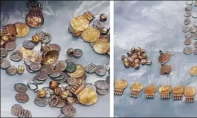 குடத்தை திறந்து பார்த்த போது 17 முத்து மணிகள், 13 தங்க பதக்கங்கள், 4 காசிமணி மாலை, 2 கம்மல், வெள்ளி நாணயங்கள் இருந்தன. இதை அறிந்த அப்பகுதி மக்கள் ஆர்வமுடன் புதையல் பொருட்களை நேரில் பார்வையிட திரண்டனர். இதையடுத்து அந்த பொருட்கள் வருவாய்த்துறையினரிடம் ஒப்படைக்கப்பட்டது.
