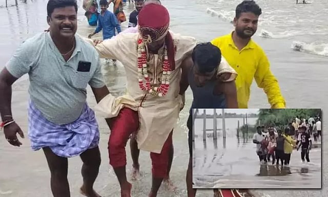 அந்த வழியாக திருமண கோஷ்டி ஒன்று மணமகனுடன் காரில் சென்றது. போக்குவரத்து பாதிப்பால் நடுவழியில் கார் நிறுத்தப்பட்டது. 4 மணி நேரம் காத்திருந்தும் வெள்ளம் வடிந்தபாடில்லை. இதனால் உறவினர்கள் மணமகனை தூக்கிக்கொண்டு ஏரி நீர் வழிந்தோடிய சாலையை கடந்து சென்றனர்.