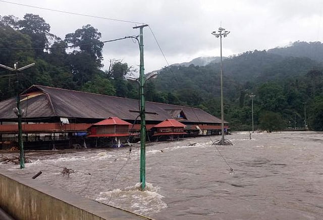 சபரிமலை பம்பை ஆற்றில் ஏற்பட்ட வெள்ளப்பெருக்கால் அங்கிருந்த கட்டிடங்கள் சிதைந்து அடித்துச் செல்லப்பட்டன. ஆற்றின் குறுக்கே பக்தர்கள் நடந்து செல்லும் 2 பாலங்கள் பலமில்லாததால் வீழ்ந்து போனது. ஆயிரக்கணக்கான பக்தர்கள் ஒரே நேரத்தில் தங்கி ஓய்வெடுக்கும் ராமமூர்த்தி மண்டபம், 200 மீட்டர் நீளமுள்ள பிரதான நடை பந்தல், அன்னதான மண்டபம், கழிப்பறை கூடங்கள் ஆகியவை வெள்ளத்தில் அடித்துச் செல்லப்பட்டன.