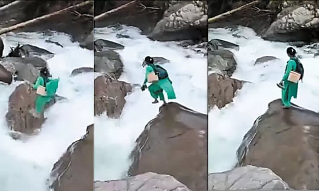 இடையே முட்டுக்கட்டையாக இருந்த காட்டாற்றை, உயிரை துச்சமாக எண்ணி கடந்து கடமையை நிறைவேற்றிவிட்டு திரும்பினார். ஆர்ப்பரிக்கும் வெள்ளத்தோடு பாய்ந்தோடிய ஆற்றை கடக்க, அதனிடையே இருந்த பாறாங்கற்கள் மீது கமலாவின் கால்கள் துள்ளிக்குதிக்கும் காட்சிகள் இணையத்தில் வெளியாகி வலைத்தளவாசிகளின் நெஞ்சை உறைய செய்து வைரல் ஆகி வருகிறது.