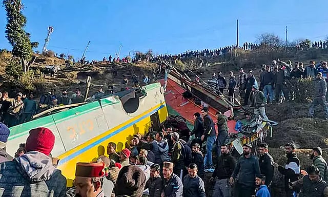 இமாசல பிரதேசத்தின் சிர்மாவுர் மாவட்டத்தில் சிம்லா நகரில் இருந்து குப்வி நகர் நோக்கி சென்ற தனியார் பஸ் ஒன்று நேற்று 500 அடி பள்ளத்தில் கவிழ்ந்து விபத்தில் சிக்கியது.