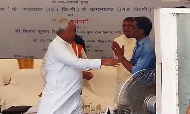 நிகழ்ச்சியில் முதல்-மந்திரி நிதிஷ்குமார் பேசும்போது, 'மாநிலத்தின் நலனுக்காக சாலைப்பணிகளை விரைந்து முடியுங்கள். நீங்கள் விரும்பினால் உங்கள் கால்களில்கூட விழுகிறேன்' என்று கூறியபடி அங்கிருந்த ஐ.ஏ.எஸ். அதிகாரி ஒருவரை நோக்கி நெருங்கினார் நிதிஷ்குமார். இதனால் மேடையில் இருந்த அனைவரும் அதிர்ச்சி அடைந்தனர். சுதாரித்துக்கொண்ட அந்த ஐ.ஏ.எஸ். அதிகாரி, பல சில அடிகள் பின்வாங்கி, 'ஐயா தயவு செய்து இப்படி செய்யாதீர்கள்' என்று பதற்றத்துடன் கூறினார்.