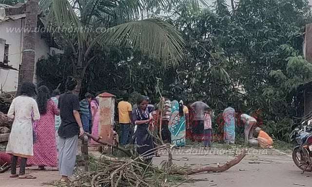அந்த மரம் சூறாவளி காற்றுக்கு தாக்குப்பிடிக்க முடியாமல் வேரோடு சாய்ந்து விழுந்தது. இந்த சந்தர்ப்பத்தில் அங்கிருந்தவர்கள் அலறி அடித்துக் கொண்டு ஓட்டம் பிடித்தனர்.
