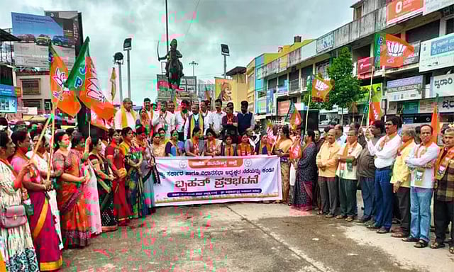 மேலும் மாநில அரசுக்கு எதிராக கண்டன கோஷங்களை எழுப்பினர். போராட்டத்தில் சன்னபசப்பா எம்.எல்.ஏ.,டி.எஸ். அருண் எம்.எல்.சி., மாநகராட்சி மேயர் சிவகுமார் மற்றும் பலர் கலந்து கொண்டனர்.