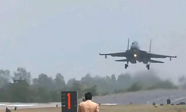 இந்தியா-பாகிஸ்தான் இடையே போர் பதற்றம் ஏற்பட்டுள்ள நிலையில், போர் விமானங்களை தரையிறக்கி ஒத்திகை நடைபெற்றுள்ள சம்பவம் பரபரப்பை ஏற்படுத்தி உள்ளது.