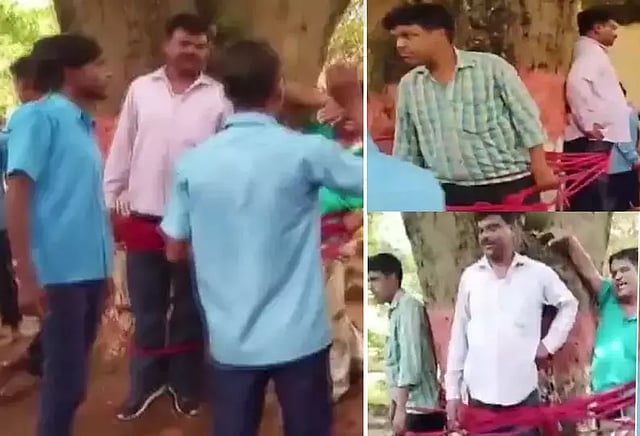 இதில் 11 மாணவர்களுக்கு 32 மதிப்பெண் மட்டுமே வழங்கப்பட்டு, அவர்கள் அனைவரும் தேர்ச்சிபெறவில்லை என்று தெரியவந்துள்ளது. இதனால் ஆத்திரம் அடைந்த மாணவர்கள், பள்ளியின் கணித ஆசிரியரான சுமன் குமார் மற்றும் பள்ளி அலுவலர் சோனேராம் சவுரே ஆகியோரை பள்ளி வளாகத்தில் இருந்த மரத்தில் கட்டி வைத்து சரமாரியாக அடித்துள்ளனர்.