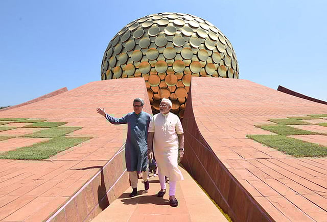 ஆரோவிலுக்கு பிரதமர் மோடி 11.30 மணிக்கு வந்தார். அங்குள்ள அரவிந்தர் சிலைக்கு மோடி மாலை அணிவித்து மரியாதை செலுத்தினார். தொடர்ந்து மாத்ரி மந்திர் தியான கூடத்துக்கு சென்று தியானத்தில் ஈடுபட்டார். இதையடுத்து பொன்விழா நிகழ்ச்சியில் பங்கேற்ற அவர் அரவிந்தர், அன்னை மற்றும் மாத்ரி மந்திர் படங்கள் அடங்கிய சிறப்பு தபால் தலையை மோடி வெளியிட்டார். ஒருங்கிணைந்த கல்வி புத்தகமும் வெளியிடப்பட்டது. ஆரோவில் இளைஞர்களுக்காக புதிதாக கட்டப்பட்டுள்ள வீடுகளின் சாவிகளை மோடி வழங்கினார்.
