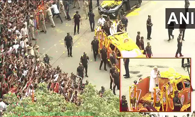 இதற்காக காவி வண்ண திறந்த காரில், நின்றபடி அவர் சென்றார். வழிநெடுகிலும் மக்கள் அவரை நோக்கி கையசைத்து, உற்சாக வரவேற்பு அளித்தனர். அவர் மீது பூக்களை அள்ளி வீசினர்.