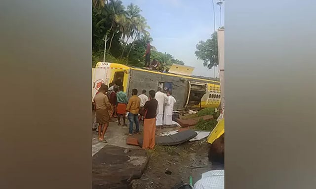 சென்னையிலிருந்து கேரள மாநிலம் கோழிக்கோடிற்கு பயணிகள் பஸ் இயங்குகிறது. இந்நிலையில் இன்று சென்னையிலிருந்து கோழிக்கோடு நோக்கி 40 பயணிகளுடன் பஸ் சென்று கொண்டிருந்தது. அப்போது கேரளாவில் உள்ள பாலக்காடு மாவட்டத்தின் திருவாழியோடு பகுதியில் செங்குத்தான சாலையில் திடீரென்று டிரைவரின் கட்டுப்பாட்டை இழந்த பஸ் சாலையோரம் இருந்த மின்கம்பத்தில் மோதி கவிழ்ந்தது. இந்த விபத்தில் சிக்கி பயணிகள் அலறினர்.