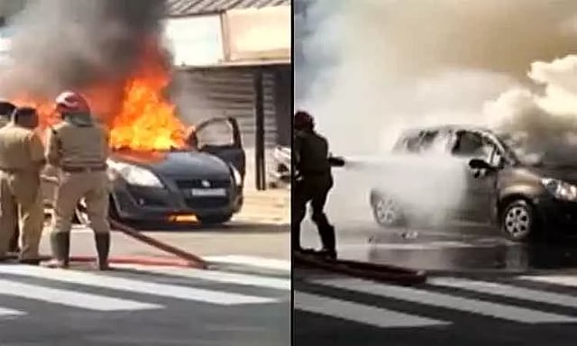 கேரள மாநிலம் எர்ணாகுளம் மாவட்டத்தில் உள்ள கச்சேரிபடி பகுதியில் சாலையில் சென்று கொண்டிருந்த காரின் முன்பகுதியில் இருந்து புகை கிளம்பியுள்ளது. இதைக் கண்ட அந்த காரின் ஓட்டுநர் உடனடியாக காரை நிறுத்தியத்தோடு, அந்த காரில் பயணம் செய்த 3 பேரும் அதில் இருந்து வெளியேறினர்.