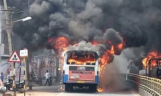 கேரள மாநிலம் திருவனந்தபுரம் அருகே தேசிய நெடுஞ்சாலையில் பயணிகள் பேருந்து திடீரென தீப்பிடித்து எரிந்ததால் பெரும் பரபரப்பு ஏற்பட்டது. அட்டிங்கல்-திருவனந்தபுரம் வழித்தடத்தில் இயக்கப்படும் அரசு பேருந்து செம்பகமங்கலம் அருகே வந்தபோது இன்ஜின் பகுதியில் புகை வெளிவந்தது. இதை கவனித்த ஓட்டுநர் உடனே பேருந்தை நிறுத்தி பயணிகளை வெளியேற்றினார்.