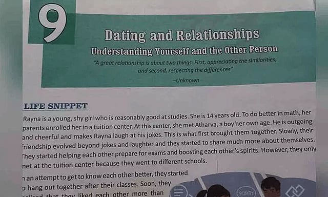 மத்திய இடைநிலை கல்வி வாரியமான சி.பி.எஸ்.இ. 9-ம் வகுப்பு பாட புத்தகத்தில் 'டேட்டிங் மற்றும் உறவுகள்' என்ற தலைப்பில் பாடம் இடம்பெற்றதாக செய்தி சமூக வலைதளங்களில் வேகமாக பரவி வருகிறது. இதற்கு சில தரப்பில் இருந்து எதிர்ப்புகளும், சில தரப்பில் இருந்து ஆதரவுகளும் வந்த வண்ணம் இருக்கின்றன.