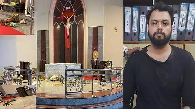 பெங்களூரு கம்மனஹள்ளி பகுதியை சேர்ந்தவர் மேத்தீவ் (வயது 29). இவர் தனது குடும்பத்துடன் வசித்து வருகிறார். கேரளாவை சேர்ந்த இவர் பெங்களூருவுக்கு வேலைக்காக குடும்பத்துடன் வந்தார். ஆனால் அவருக்கு வேலை ஏதும் கிடைக்கவில்லை என கூறப்படுகிறது. இவர் ஒரு பெண்ணை காதலித்து வந்ததாகவும், கடந்த சில மாதங்களுக்கு முன்பு அவருக்கு காதல் தோல்வி ஏற்பட்டதாகவும் கூறப்படுகிறது. இதனால் அவர் கடந்த நாட்களில் மனஉளைச்சலுடன் இருந்துள்ளார். இந்த நிலையில் நேற்று அதிகாலையில் சுமார் 4 மணி அளவில் அவர் அந்த பகுதியில் உள்ள கிறிஸ்தவ தேவாலயத்திற்கு சென்றார். உள்ளே சென்ற அவர், திடீரென அங்கிருந்த பொருட்களை உடைத்து சேதப்படுத்தினார். அங்கிருந்த கண்ணாடி பொருட்கள், அழகு