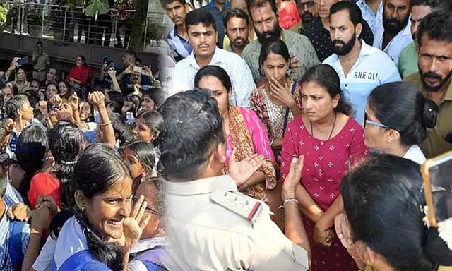 இருப்பினும் பள்ளி நிர்வாகம் ஆசிரியை மீது நடவடிக்கை எடுக்காத நிலையில், நேற்று மீண்டும் பள்ளி மாணவ-மாணவிகள் மற்றும் அவர்களின் பெற்றோர் என நூற்றுக்கணக்கானோர் பள்ளியின் வாசல் முன்பு திரண்டு போராட்டத்தில் ஈடுபட்டனர். அப்போது, பள்ளி மாணவ-மாணவிகள் 'ஜெய் ஸ்ரீராம்' என கோஷம் எழுப்பினார்கள்.