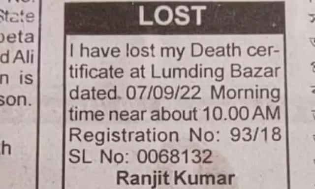 வடகிழக்கு மாநிலங்களில் ஒன்றான அசாமில், நாளிதழ் ஒன்றில் வெளியான விளம்பரம் இணையத்தில் பேசுபொருளாகியுள்ளது. ரஞ்சித்குமார் என்பவர் பெயரில் வெளியான அந்த விளம்பரத்தில், எனது இறப்பு சான்றிதழ் தொலைந்து விட்டது என்று கொடுக்கப்பட்டுள்ளது. கடந்த 7 ஆம் தேதி தொலைந்துவிட்டதாகவும் சான்றிதழ் எண்ணும் பகிரப்பட்டுள்ளது.