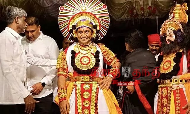 உத்தர கன்னடா மாவட்டம் பட்கல்லில் யக்ஷகானா நிகழ்ச்சி நடந்தது. இதில் மந்திரிகள் கோட்டா சீனிவாச பூஜாரி, மந்திரி சுதாகர் ஆகியோர் கலந்துகொண்டு யக்ஷகானா நிகழ்ச்சியை தொடங்கி வைத்தனர். அப்போது, மந்திரி சுதாகர், யக்ஷகானா கலைஞர் போல வேடம் அணிந்து வந்தார். இது பார்வையாளர்களை வெகுவாக கவர்ந்தது. இதுதொடர்பான புகைப்படம், வீடியோ சமூக வலைத்தளங்களில் வைரலாகி வருகிறது.