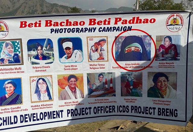 பெண் குழந்தைகளை பாதுகாப்போம்; பெண் குழந்தைகளுக்கு கற்பிப்போம் என்ற பெயரில் மத்திய அரசு ஒரு திட்டத்தை வழிநடத்தி வருகிறது. இந்த திட்டத்திற்கான ஜம்மு காஷ்மீர் அரசின் பிரசார போஸ்டரில் பாகிஸ்தான் பயங்கராவதி ஹபீஸ் சயீத்துடன் தொடர்புடையவர் என கூறப்படும், சிறையில் அடைக்கப்பட்டு உள்ள பெண் பிரிவினைவாதி ஆஷியா அன்ட்ரபியின் புகைப்படம் இடம்பெற்று இருந்தது.