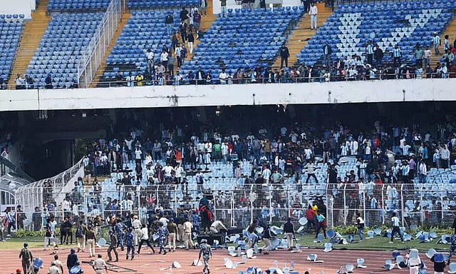 இதனால் ரசிகர்கள் மைதானத்தில் இருந்த பொருட்களை சூறையாட தொடங்கினர். மைதானத்தில் தண்ணீர் பாட்டில்களை எறிந்தும் மைதானத்தில் அமைக்கப்பட்டிருந்த மேடையை அடித்தும் ரசிகர்கள் வன்முறையில் ஈடுப்பட்டனர்.