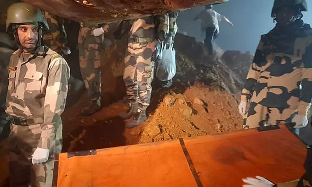 இந்த சம்பவத்தில் 12 தொழிலாளர்கள் சிக்கி கொண்டனர். இதுபற்றி தகவல் அறிந்து எல்லை பாதுகாப்பு படையினர் உடனடியாக அந்த பகுதிக்கு அனுப்பி வைக்கப்பட்டனர்.