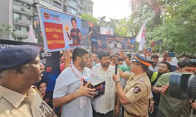 சச்சின் தெண்டுல்கர் ஆன்லைன் விளையாட்டு விளம்பரத்தில் நடித்ததை கண்டித்து இந்த போராட்டம் நடைபெற்றது. போராட்டம் குறித்து பச்சு கடு எம்.எல்.ஏ. கூறியதாவது:-