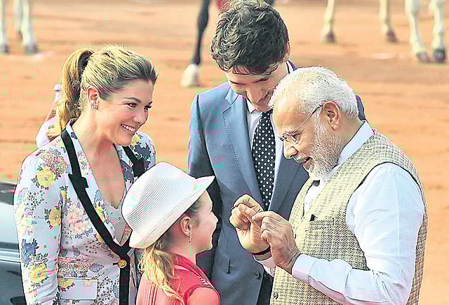 நேற்று காலை ஜனாதிபதி மாளிகைக்கு தனது குடும்பத்தினருடன் வந்த அவரை ஜனாதிபதி ராம்நாத் கோவிந்த், பிரதமர் மோடி மற்றும் மத்திய மந்திரிகள் உற்சாகமாக வரவேற்றனர். அப்போது அவருக்கு ராணுவ அணிவகுப்பு மரியாதையும் அளிக்கப்பட்டது. அப்போது ஜஸ்டின் ட்ரூடோவின் மகளிடம் இந்தியாவை சுற்றிப் பார்த்தது குறித்து மோடி கேட்டறிந்தார்.