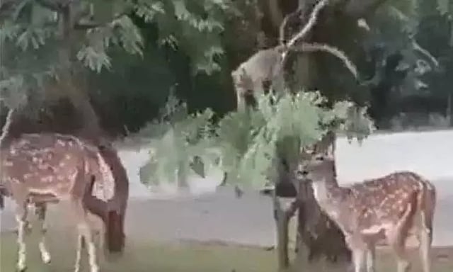 அப்போது அந்த மரத்தில் அமர்ந்திருந்த குரங்கு ஒன்று, தன்னுடைய முயற்சியால், மரத்தின் ஒரு பகுதி கிளைகளை வளைத்து கொடுக்கிறது. அதனை தங்களுக்கு சாதகமாக பயன்படுத்திக்கொண்ட மான்கள், லாவகமாக இலைகளை உண்ணத்தொடங்குகிறது.