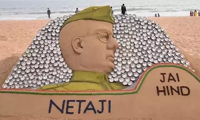இந்நிலையில், ஒடிசா மாநிலத்தின் புரி கடற்கரையில் மணல் சிற்பக் கலைஞரான சுதர்சன் பட்நாயக் நேதாஜியின் மணல் சிற்பத்தை உருவாக்கியுள்ளார்.
