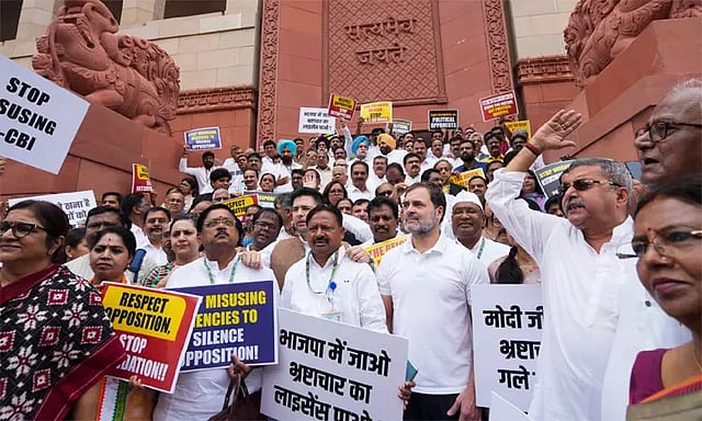 இந்தநிலையில் நாடாளுமன்ற வளாகத்தில் இந்தியா கூட்டணி எம்.பி.க்கள் எதிர்க்கட்சி தலைவர் ராகுல்காந்தி தலைமையில் போராட்டத்தில் ஈடுபட்டு வருகின்றனர். விசாரணை அமைப்புகளை மத்திய அரசு தவறாக பயன்படுத்துவதாக கூறி முழக்கத்தில் ஈடுபட்டனர். மக்களவை, மாநிலங்களவை எதிர்க்கட்சி உறுப்பினர்கள் ஆர்ப்பாட்டத்தில் கலந்து கொண்டனர்.