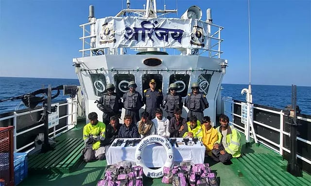 இந்திய கடல் பகுதியில் 10 பணியாளர்களுடன் நுழைந்த பாகிஸ்தான் மீன்பிடி படகை கடலோர காவல் படையினர் கைப்பற்றினர். மேலும் படகிலிருந்த ரூ. 300 கோடி மதிப்புள்ள ஆயுதங்கள், வெடிமருந்துகள் மற்றும் போதைப்பொருளை பறிமுதல் செய்தனர்.