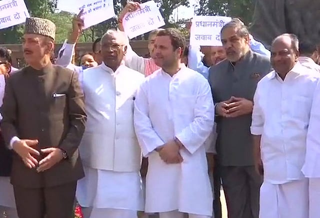 பஞ்சாப் நேஷனல் வங்கி முறைகேடு வழக்கில் தொடர்புடைய நிரவ் மோடியை பாஜக அரசு பாதுகாப்பதாக கூறி, காங்கிரஸ் எம்.பிக்கள் அக்கட்சியின் தலைவர் ராகுல் காந்தி தலைமையில் பாராளுமன்ற வளாகத்தில் போராட்டத்தில் ஈடுபட்டனர். நிரவ் மோடி, விவகாரத்தில் பிரதமர் மோடி மவுனத்தை கலைக்க வேண்டும் என்று கோரி காங்கிரஸ் எம்.பிக்கள் கோஷம் இட்டனர். இந்த போராட்டத்தில் காங்கிரஸ் தலைவர் ராகுல்காந்தியும் கலந்து கொண்டார்.