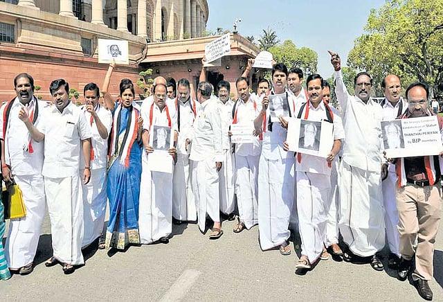 முன்னதாக காலையில் அ.தி.மு.க. எம்.பி.க்கள் பெரியார் படத்தை கையில் ஏந்தி கோஷமிட்டவாறே நாடாளுமன்றத்துக்கு வந்தனர்.