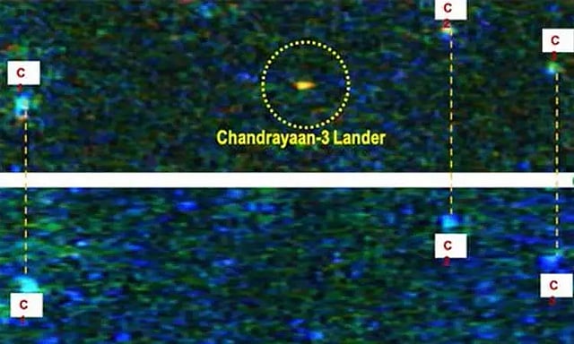இந்த நிலையில் சந்திரயான்-2 ஆர்பிட்டரின் ரேடார் எடுத்த சந்திரயான்-3 விக்ரம் லேண்டரின் புகைப்படத்தை இஸ்ரோ வெளியிட்டுள்ளது. கடந்த 6-ந்தேதி சந்திரயான்-2 ஆர்பிட்டரில் உள்ள இரட்டை அதிர்வெண் செயற்கை துளை ரேடார் (DFSAR) கருவி, சந்திரயான்-3 லேண்டரை புகைப்படம் எடுத்ததாக இஸ்ரோ தெரிவித்து உள்ளது.